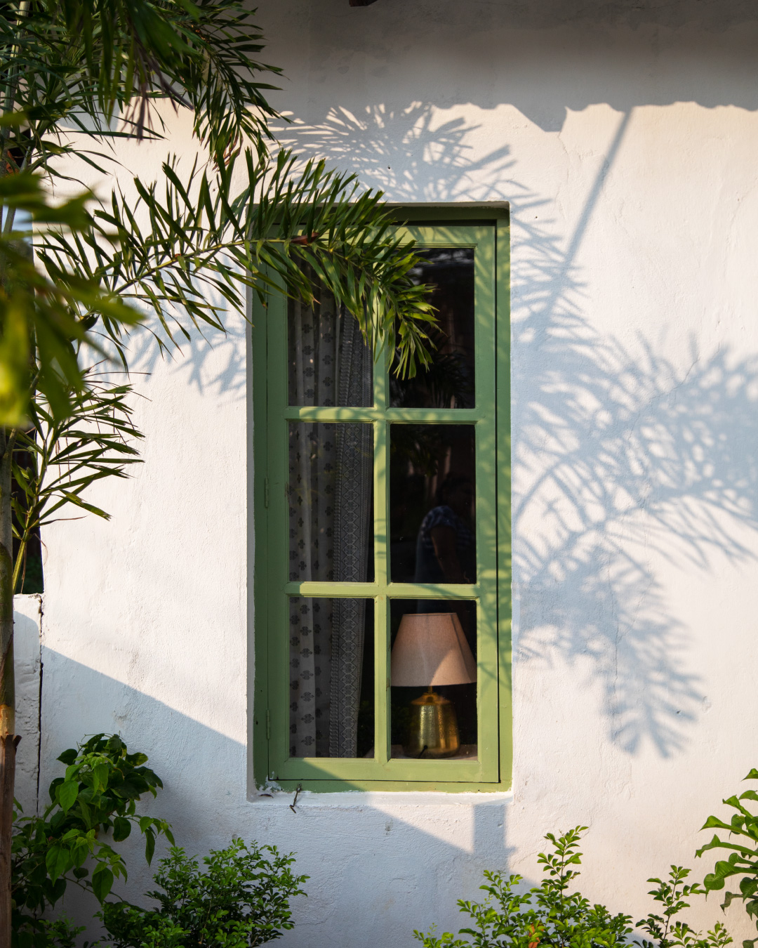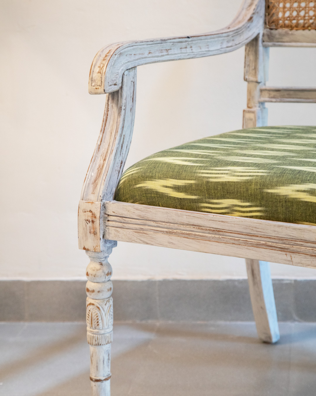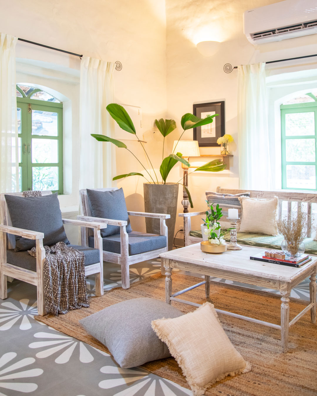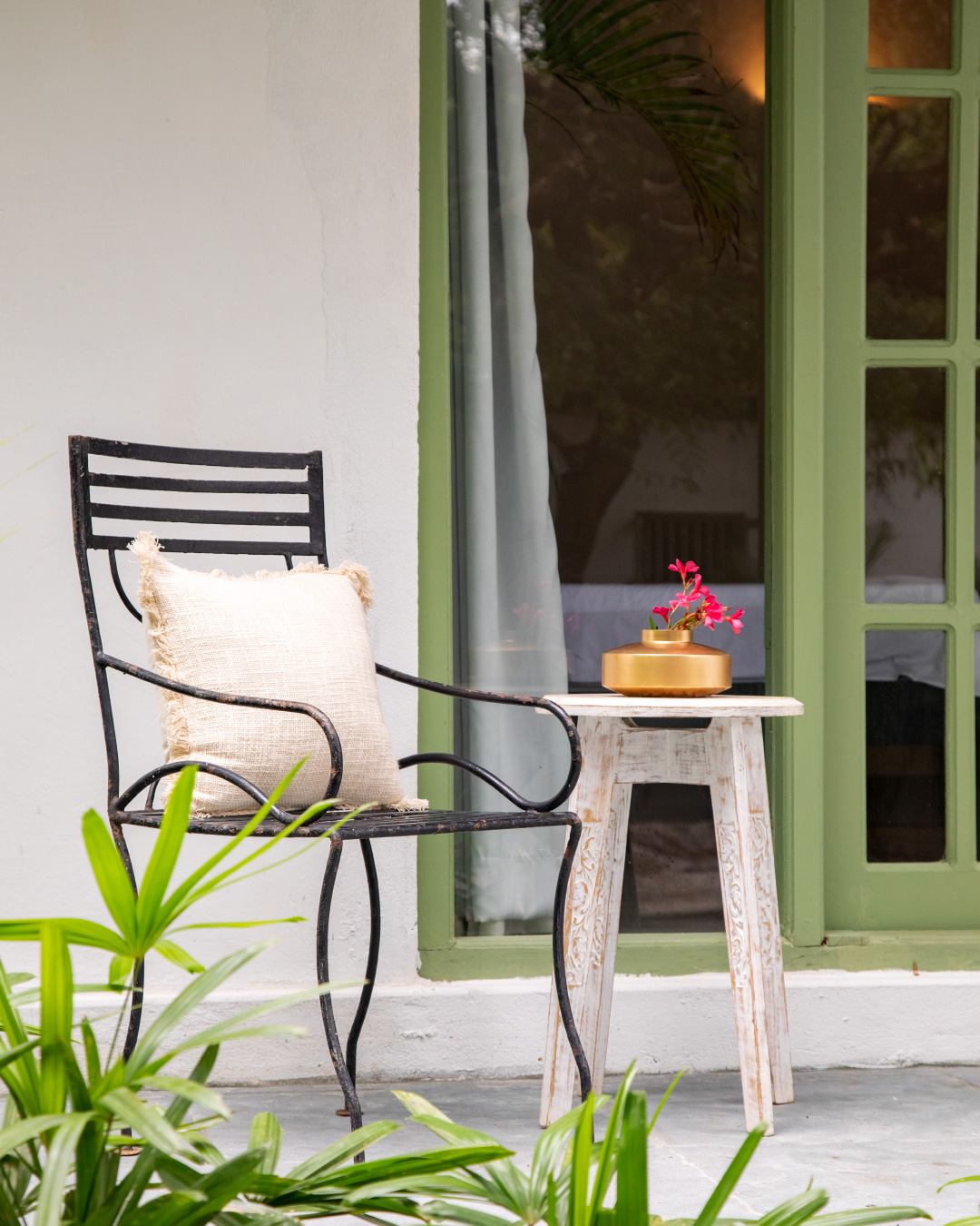 For the interiors, we decided to go with a fresh palette – the butterscotch walls, dark brown doors and beige glossy tiles were replaced with a soft white walls, fresh sage and cool grey cement flooring. Most of the furniture is refurbished pieces that belonged to the home itself.