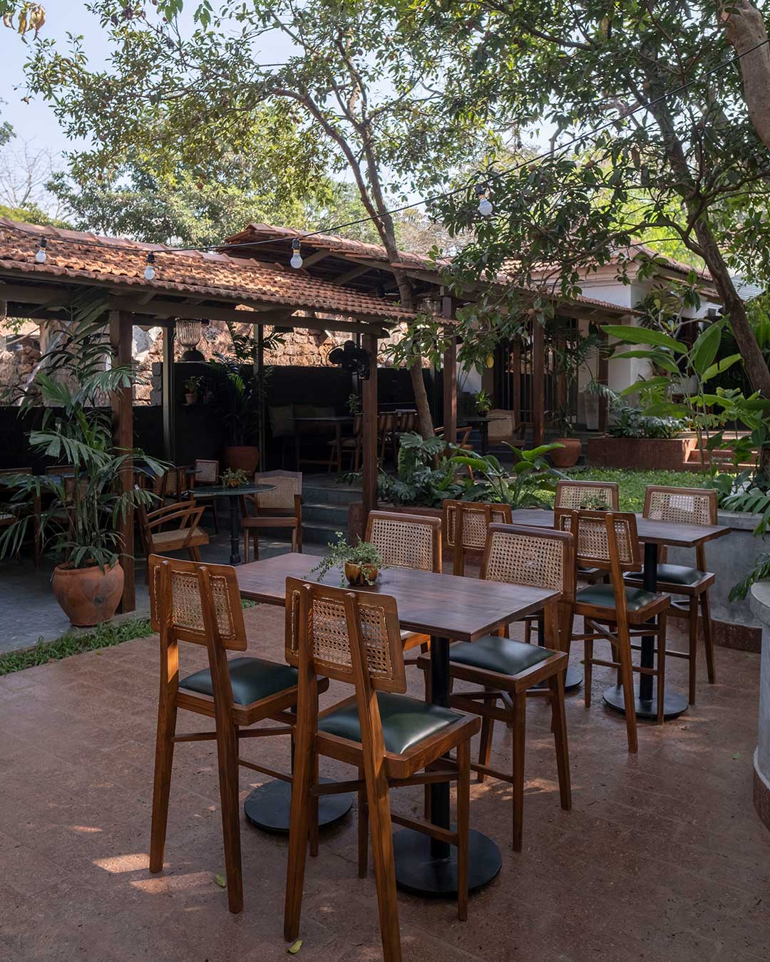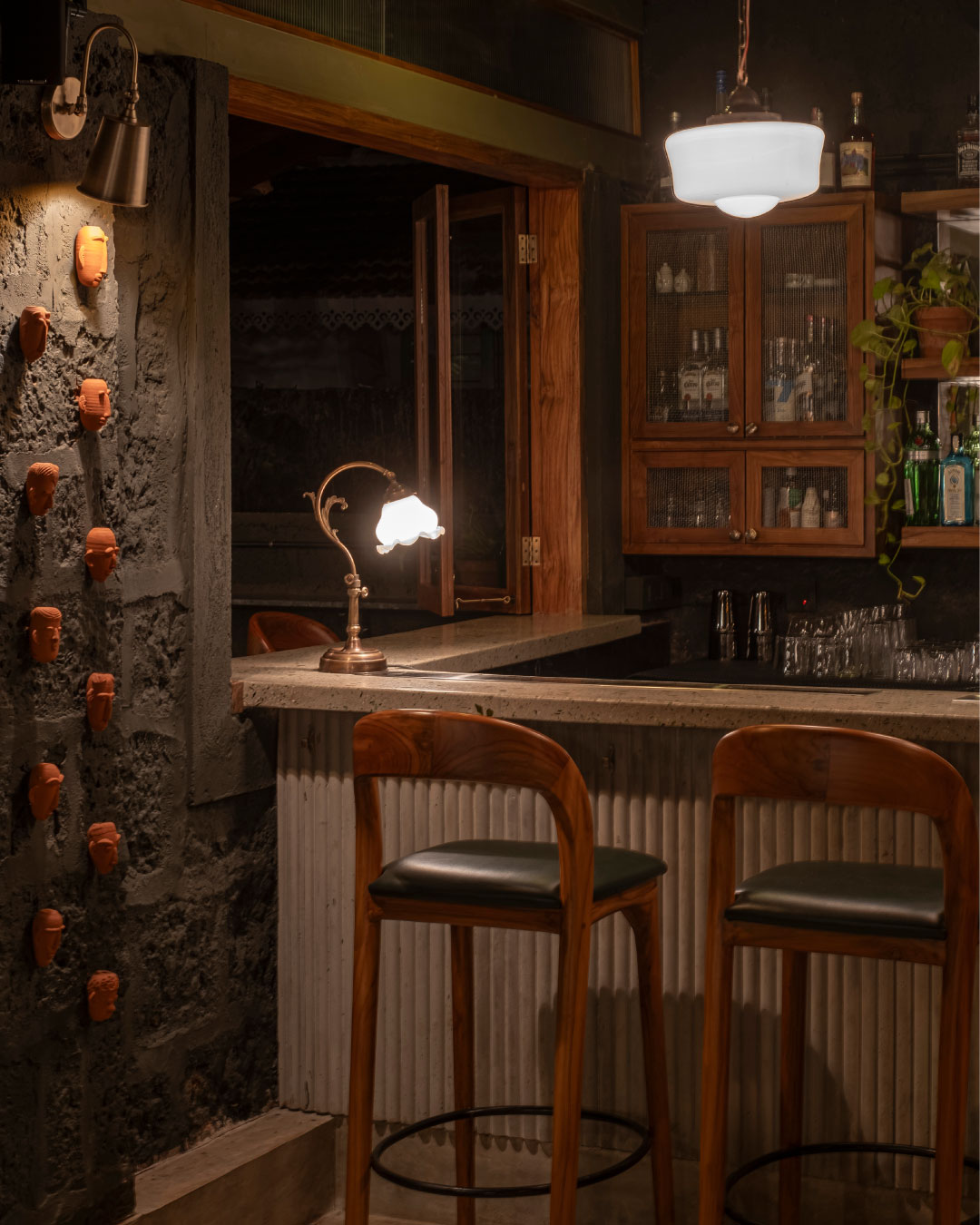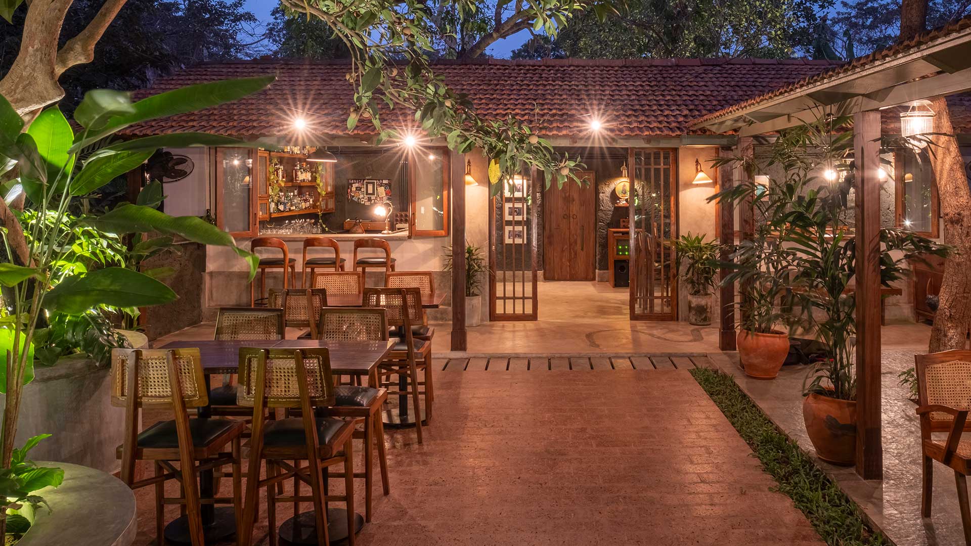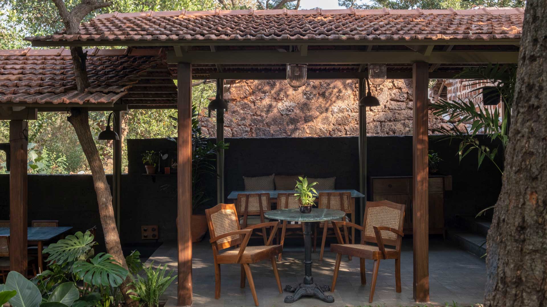 The aged laterite stone facade of the bar has been left untouched. For the inside of the bar, we retained the undulated surface of the laterite and finished it in a charcoal black paint. Grey cement oxide flooring, and a terrazzo bar counter that incorporates glass chips from recycled alcohol bottles compliment the charcoal walls. The garden is finished in a polished laterite flooring that seamlessly envelopes the floor, the steps and the planters. The semi-open seating area has a Kota stone flooring and a newly constructed Mangalore tiled roof. The dim lights and decor are sourced from antique stores in Goa.