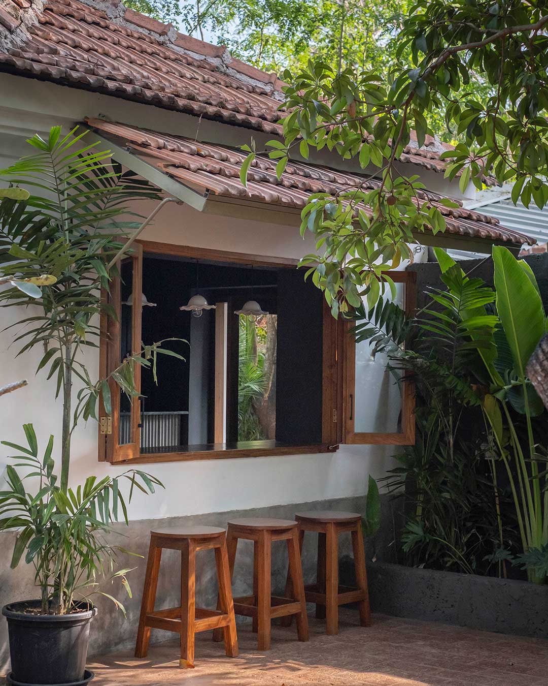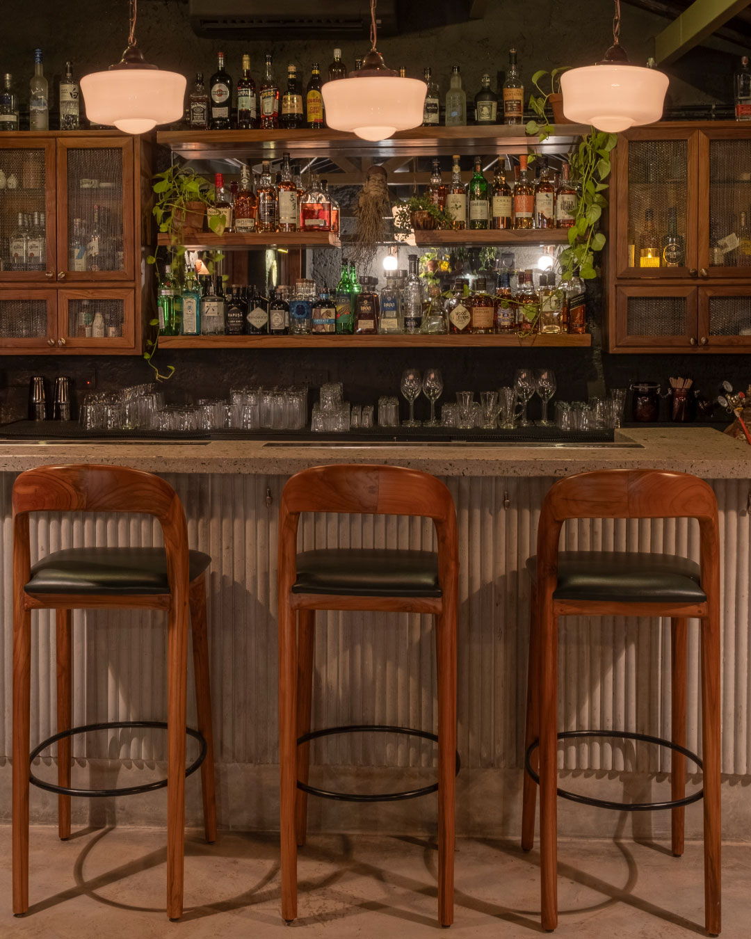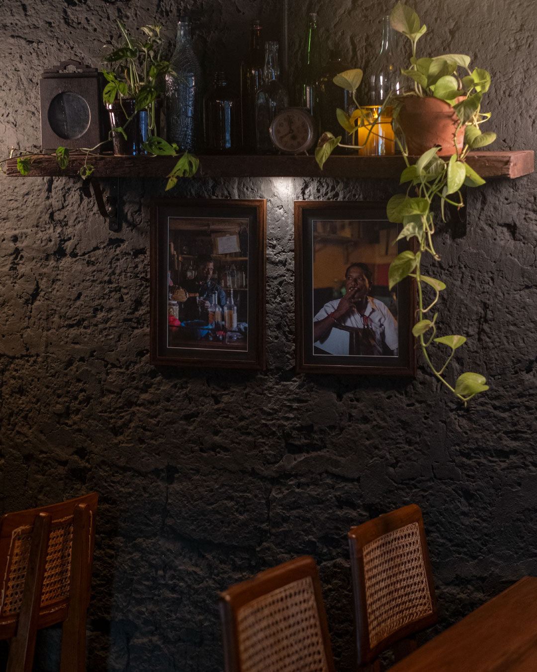 The aged laterite stone facade of the bar has been left untouched. For the inside of the bar, we retained the undulated surface of the laterite and finished it in a charcoal black paint. Grey cement oxide flooring, and a terrazzo bar counter that incorporates glass chips from recycled alcohol bottles compliment the charcoal walls. The garden is finished in a polished laterite flooring that seamlessly envelopes the floor, the steps and the planters. The semi-open seating area has a Kota stone flooring and a newly constructed Mangalore tiled roof. The dim lights and decor are sourced from antique stores in Goa.