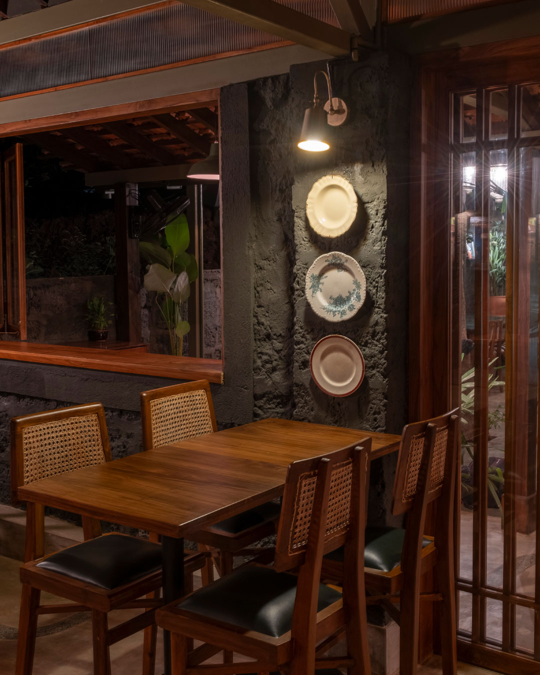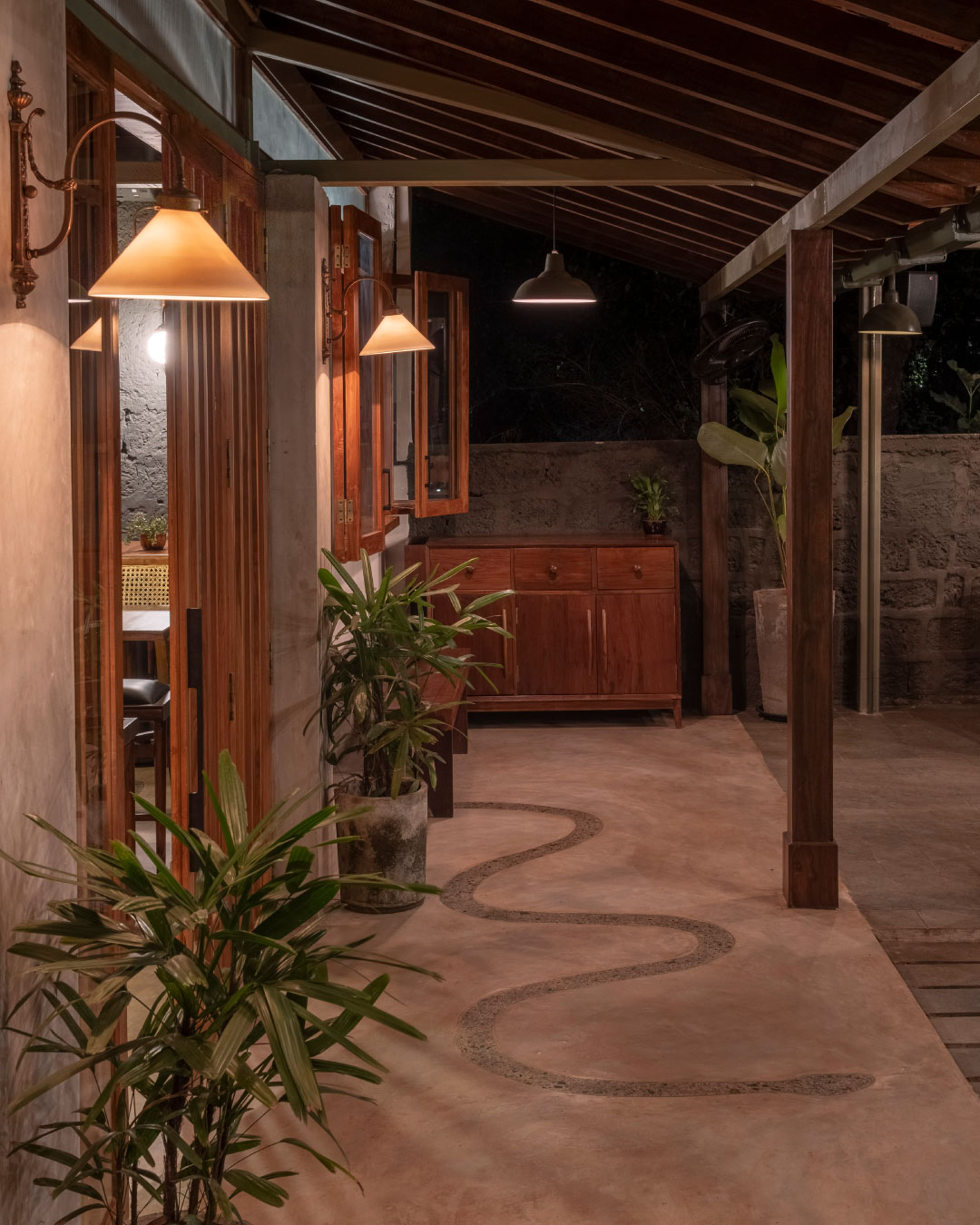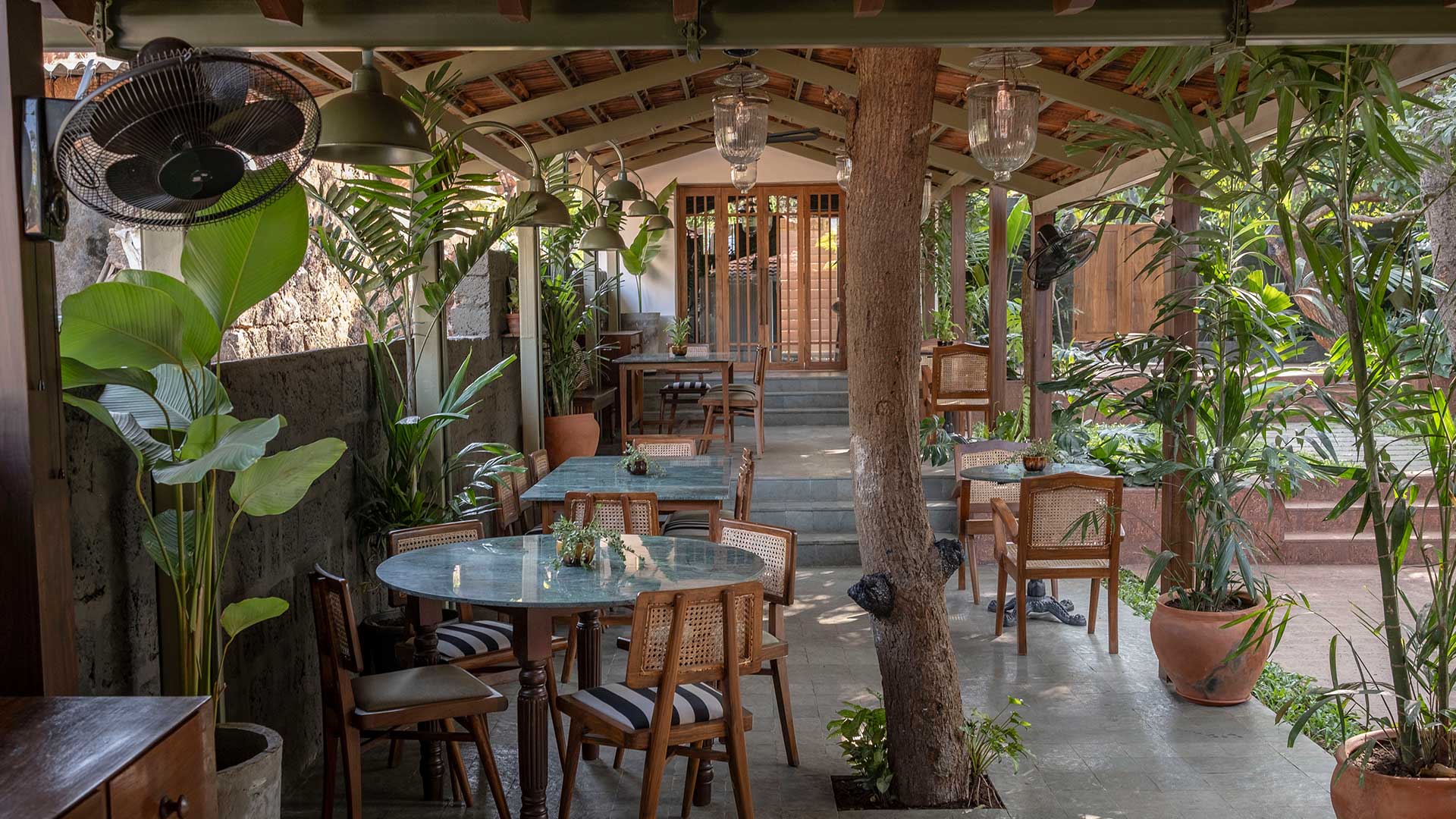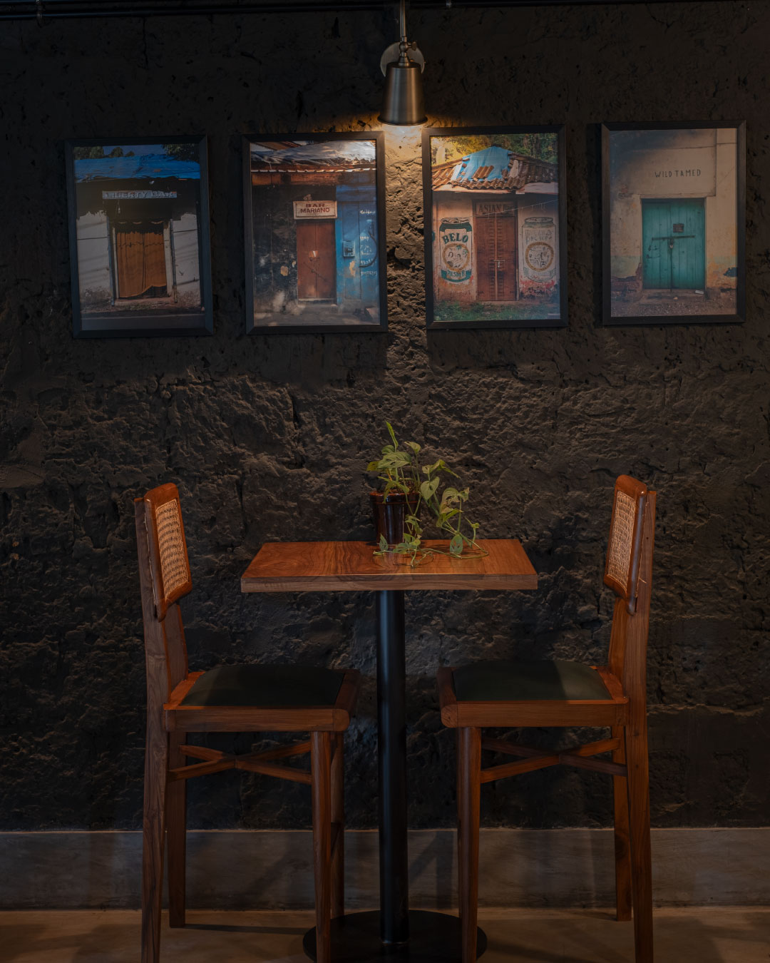 The aged laterite stone facade of the bar has been left untouched. For the inside of the bar, we retained the undulated surface of the laterite and finished it in a charcoal black paint. Grey cement oxide flooring, and a terrazzo bar counter that incorporates glass chips from recycled alcohol bottles compliment the charcoal walls. The garden is finished in a polished laterite flooring that seamlessly envelopes the floor, the steps and the planters. The semi-open seating area has a Kota stone flooring and a newly constructed Mangalore tiled roof. The dim lights and decor are sourced from antique stores in Goa.