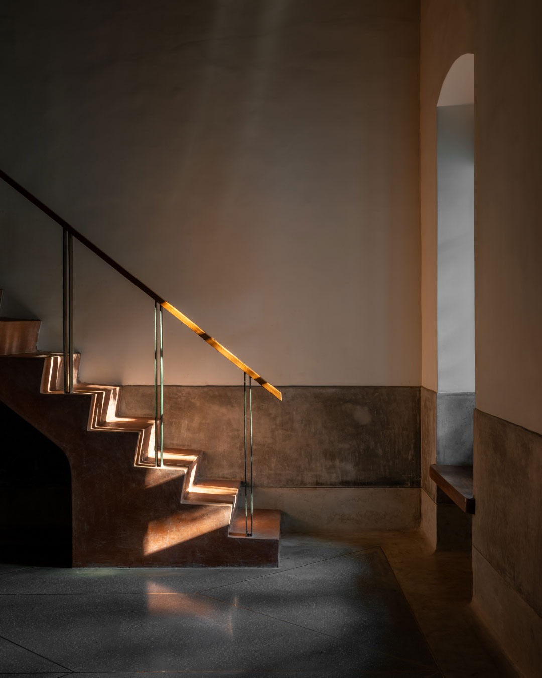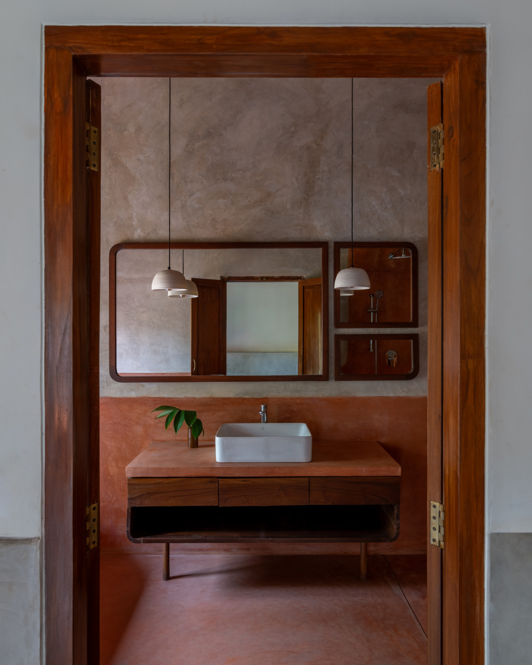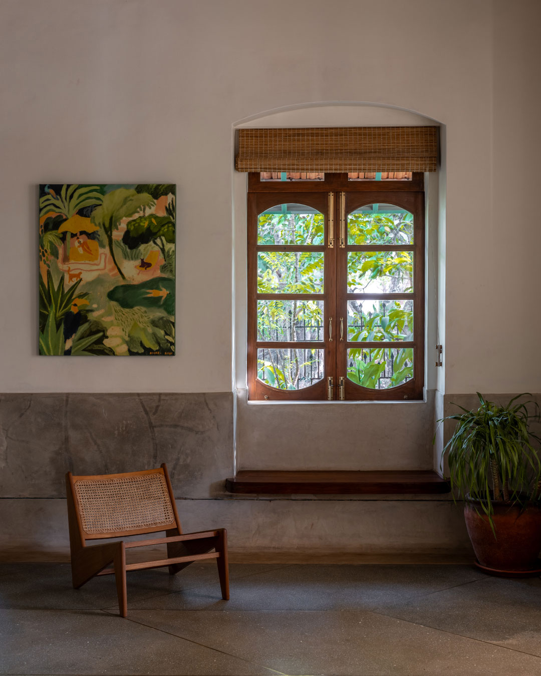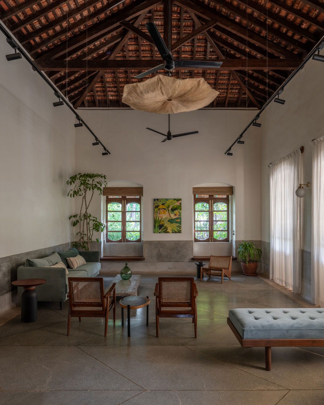We dropped the red oxide flooring for a cool grey terrazzo, the ornate chandeliers for paper, fabric, terracotta and metal lights and traditional furniture for contemporary, clean and mid-century modern pieces. The open kitchen/ dining area, staircase and the master bedroom are new additions to the home. Instead of trying to mimic the architecture of the existing structure, we designed the extension to be contemporary and clean. It’s definitely important to respect the past but also to design and build work that is representative of us as architects and designers of the 21st century. Working with local materials, sourcing from local antique stores, engaging with Goan artists and artisans were all integral to the design process.