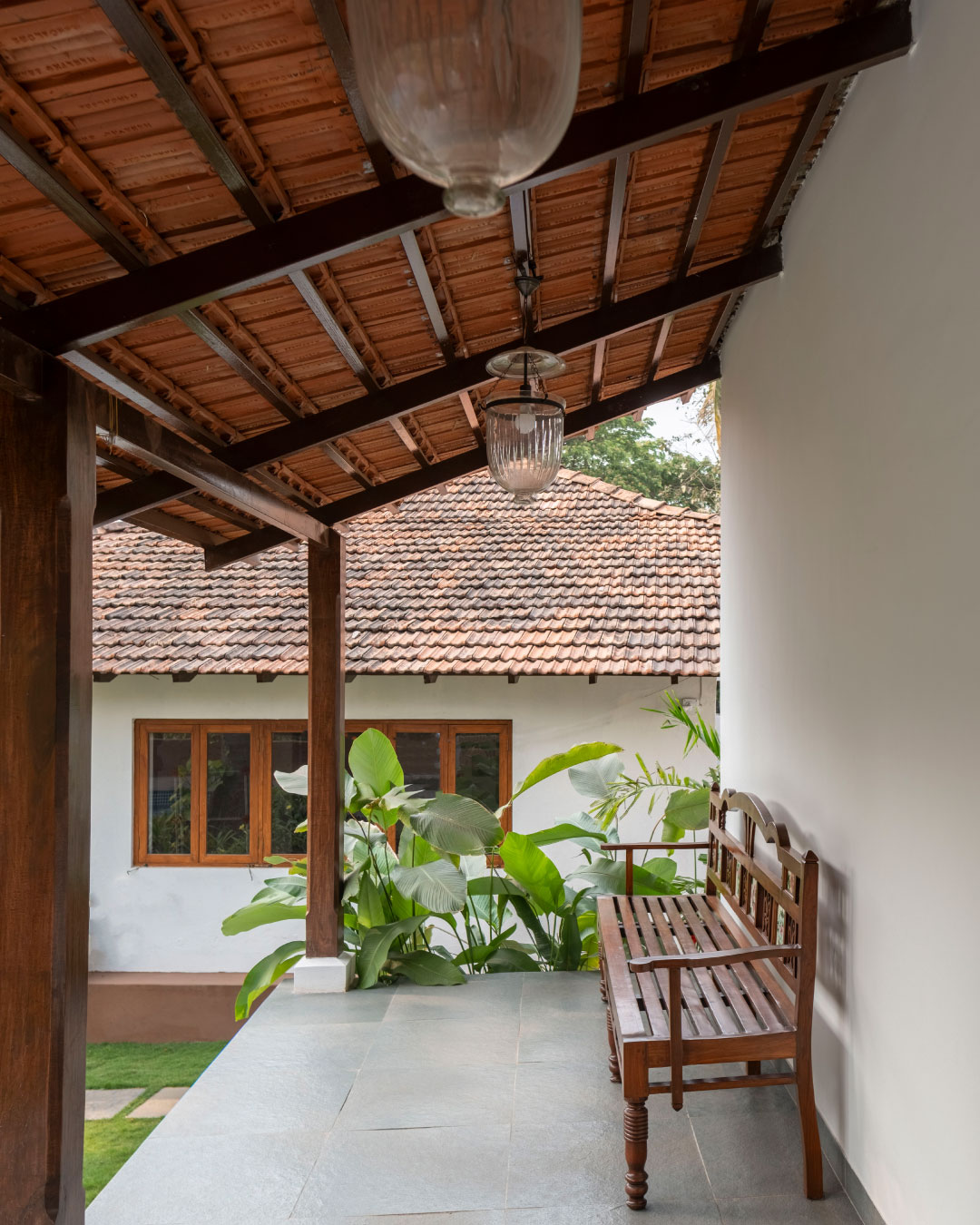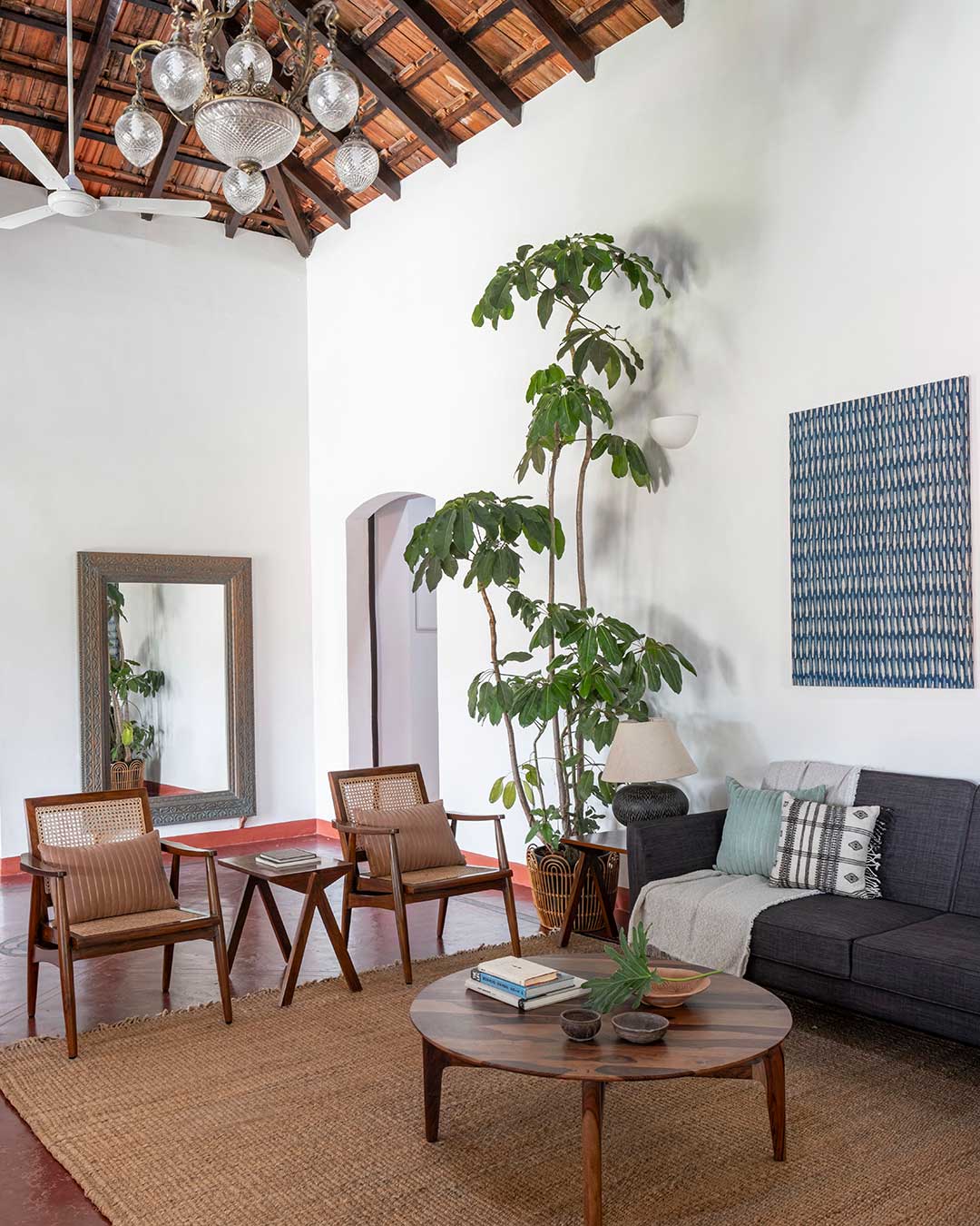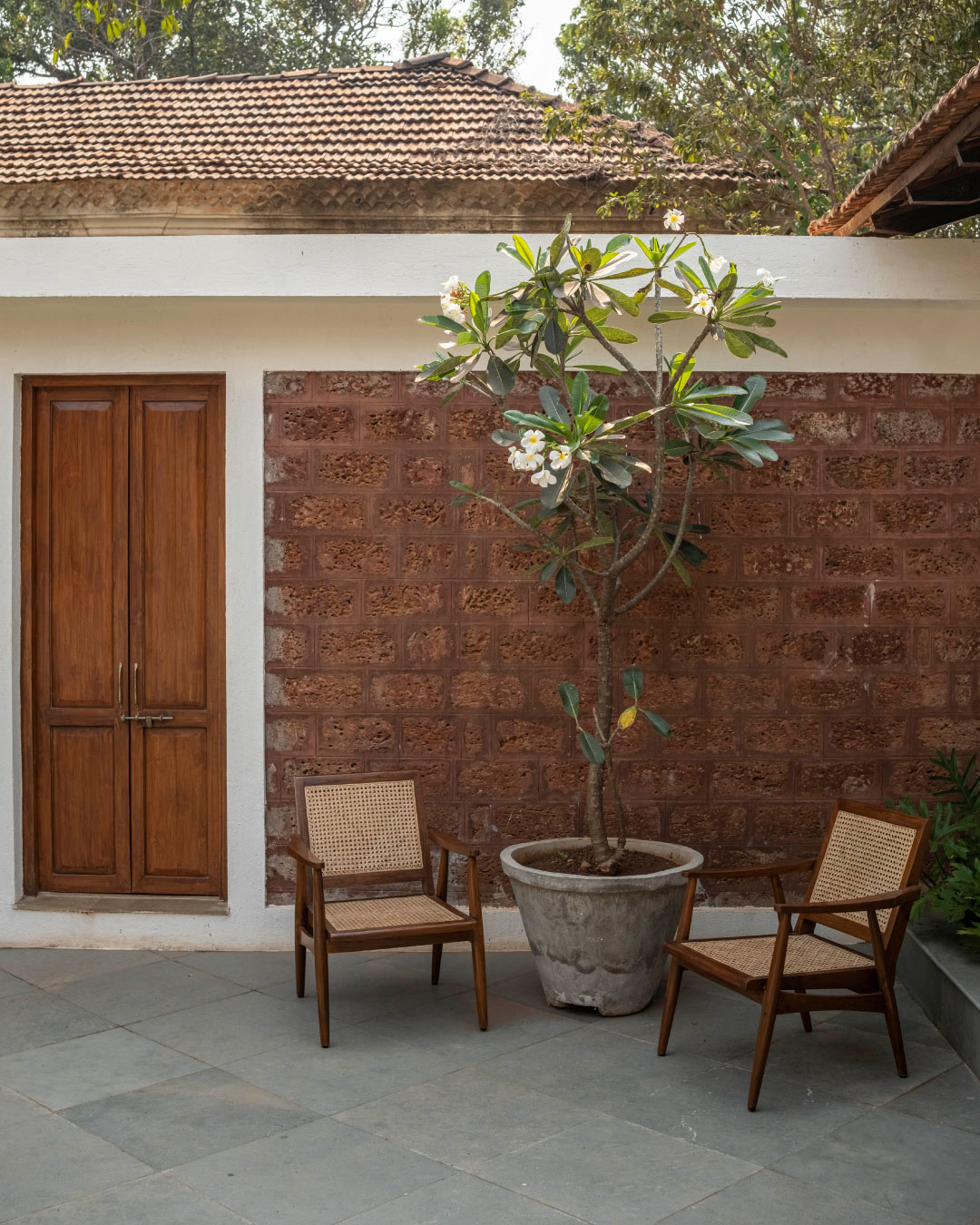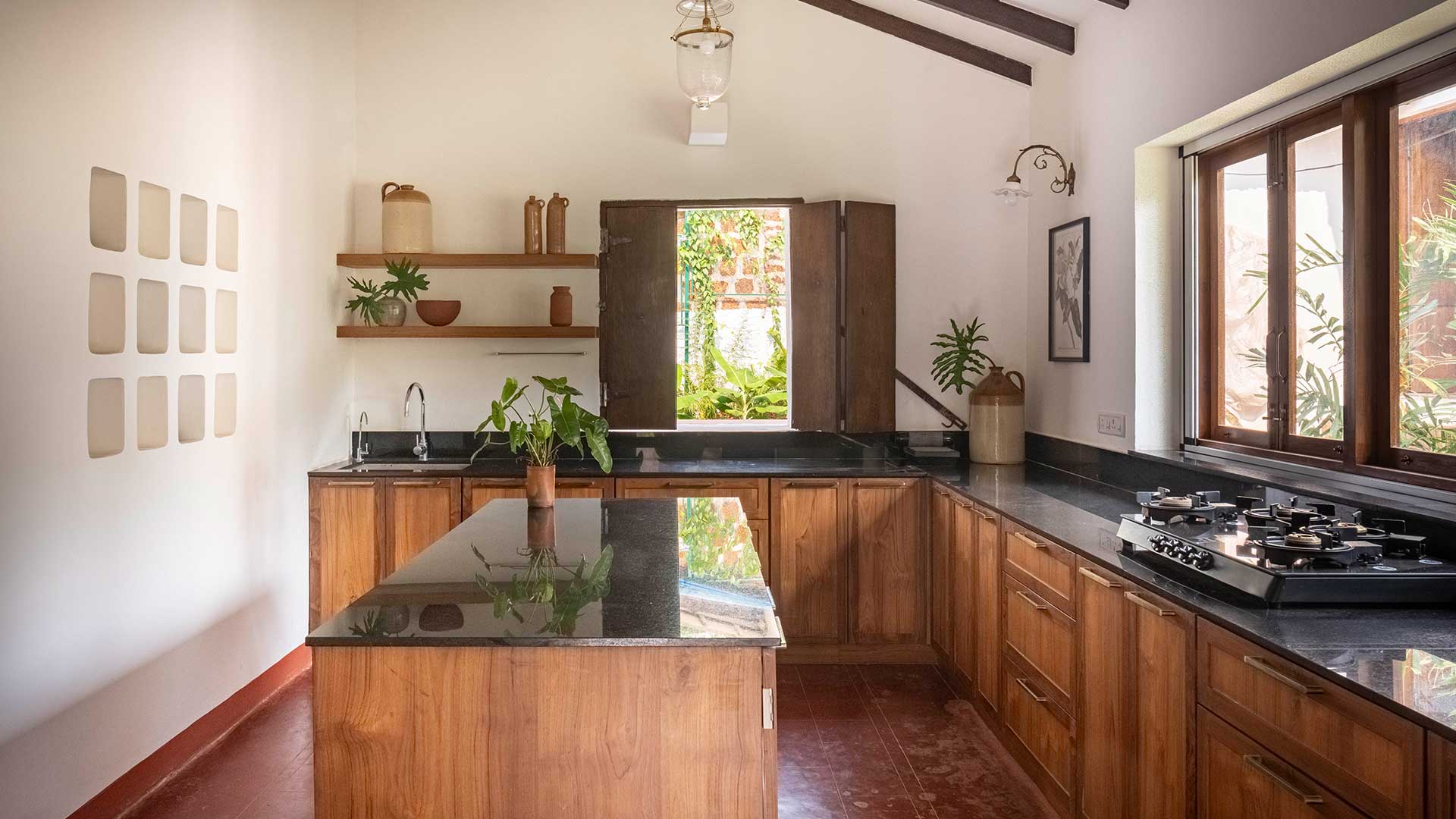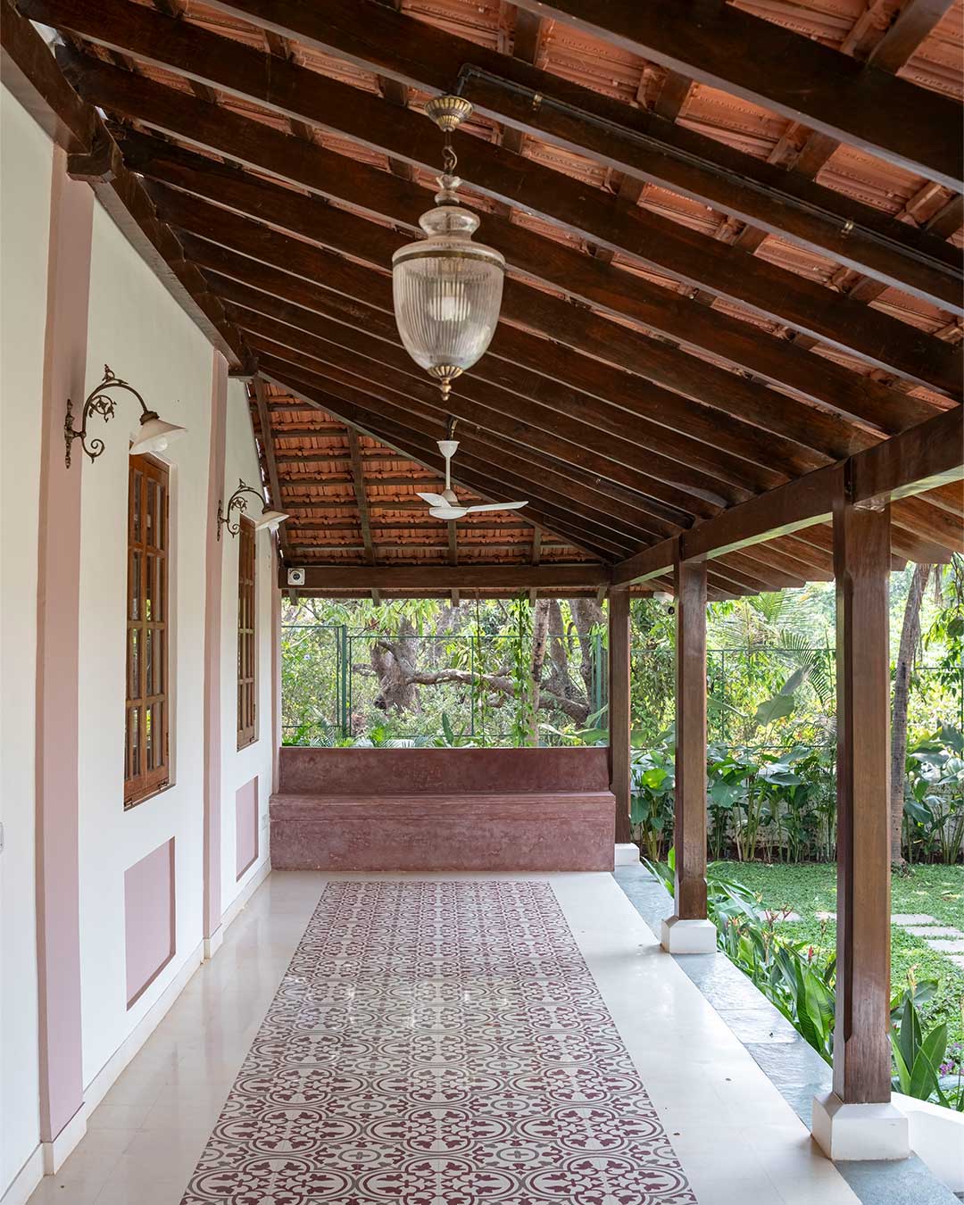 We opted for a palette of natural and handmade materials for the home. We chose to retain the red oxide flooring from the original home, and built our palette around it. Soft shades of dusty rose and ivory for the exterior and warm teak wood, natural honey kota, patterned tiles and salmon cement oxide in the interior. The home is complete with antique Goan light fixtures, wooden furniture, pastel hued soft furnishings and soothing art.