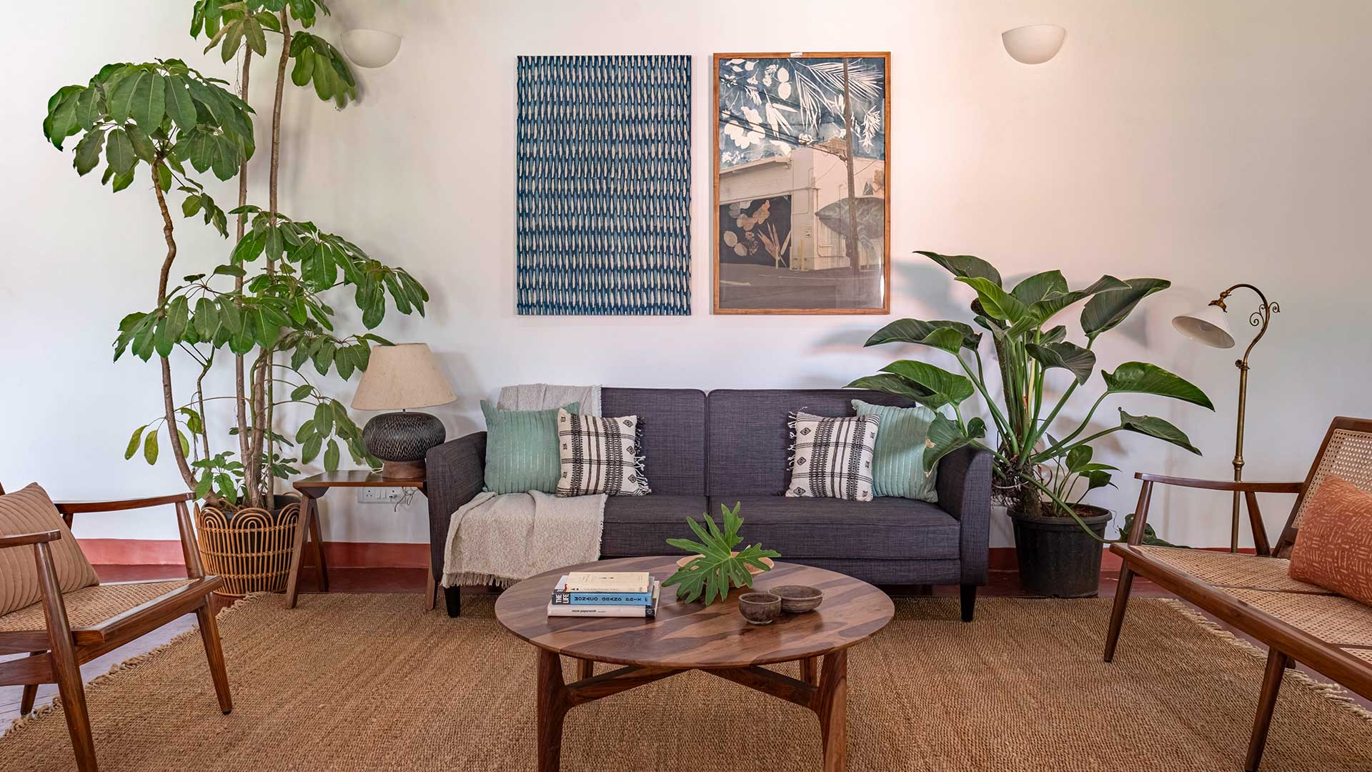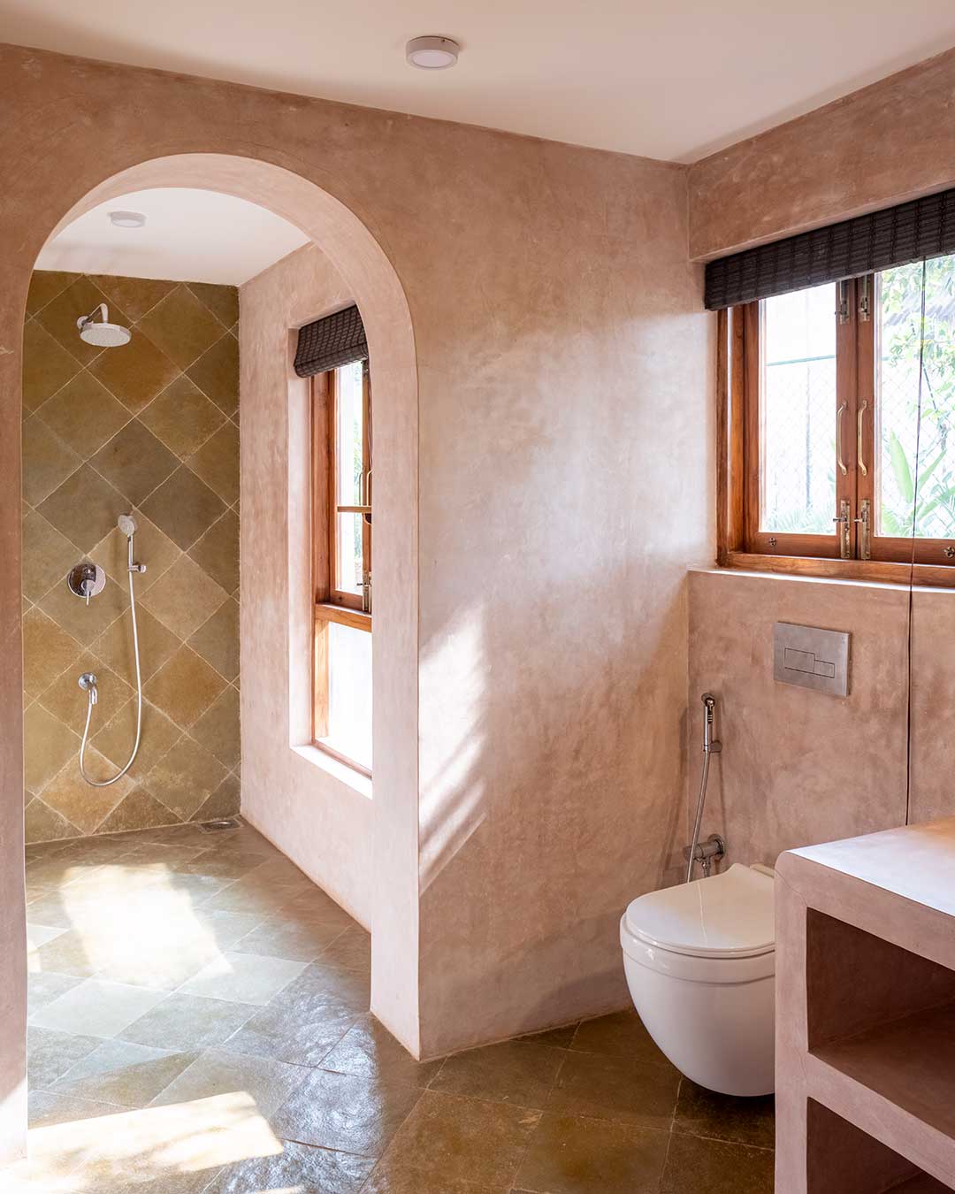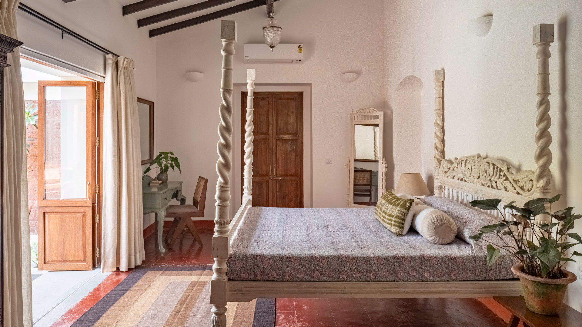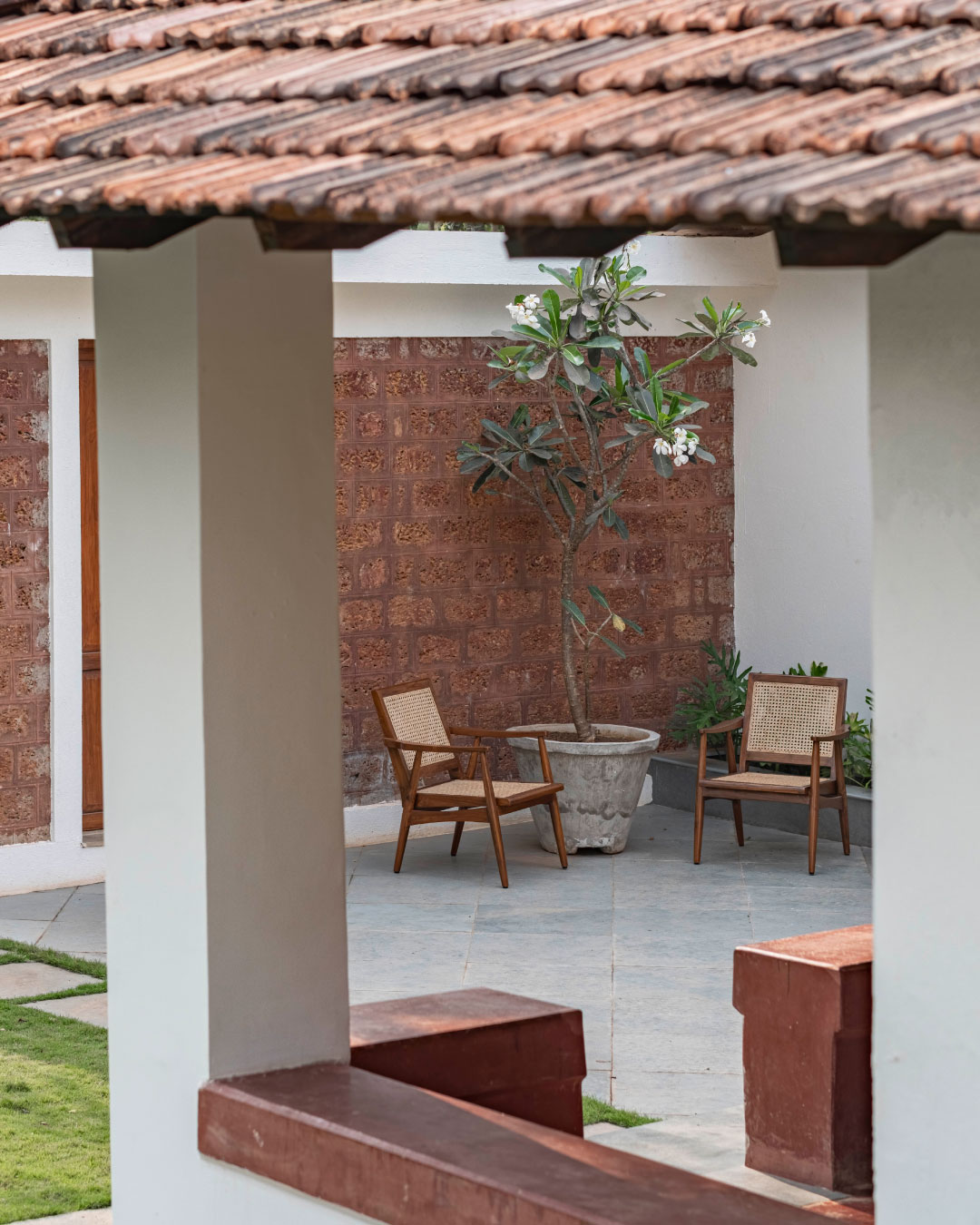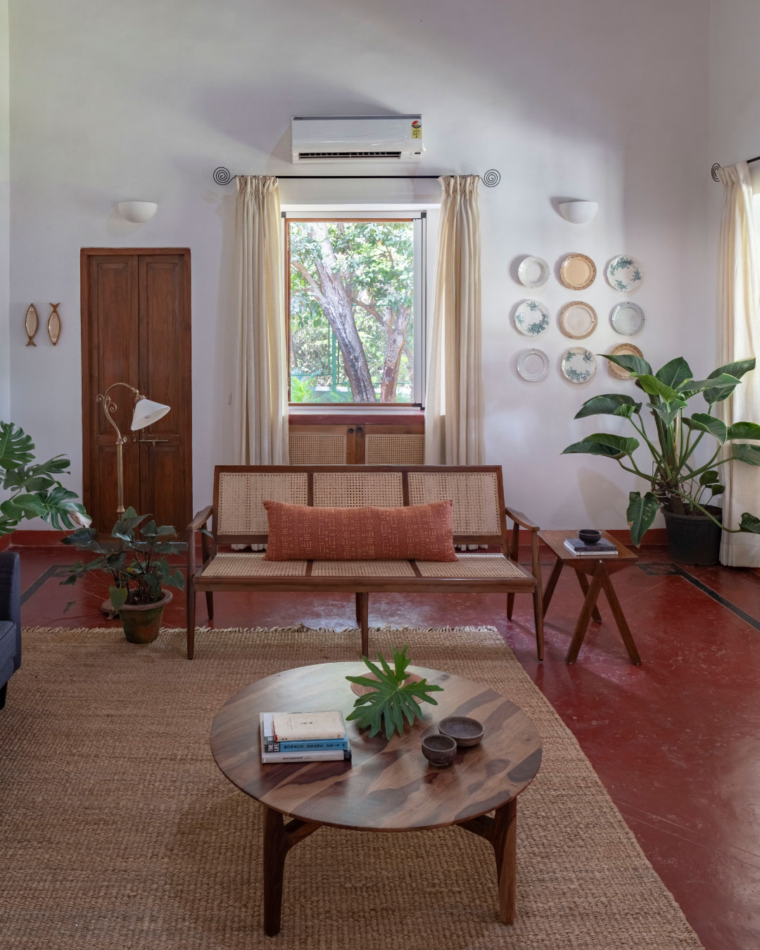 We opted for a palette of natural and handmade materials for the home. We chose to retain the red oxide flooring from the original home, and built our palette around it. Soft shades of dusty rose and ivory for the exterior and warm teak wood, natural honey kota, patterned tiles and salmon cement oxide in the interior. The home is complete with antique Goan light fixtures, wooden furniture, pastel hued soft furnishings and soothing art.